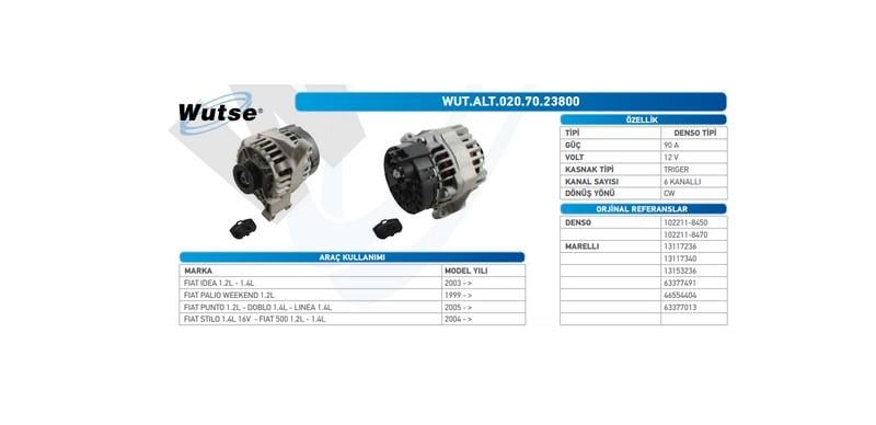 12V ALTERNATÖR DİNAMO MARELLI-DENSO TİPİ 90 A (L) FIAT 500/PUNTO/DOBLO (BENZİNLİ) (WUTSE ALT.020.70.23800)