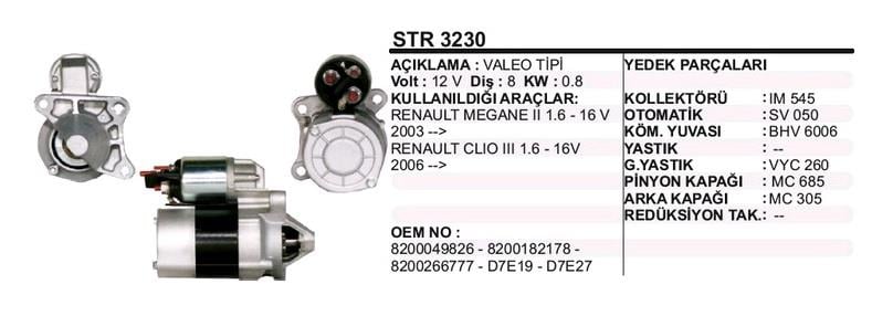 12V MARŞ MOTORU VALEO TİPİ 8 DİŞ 0.85 KW R19/R21/CLIO/MEGANE (SOL AÇIK) (D7E19) (DODO STR3230)