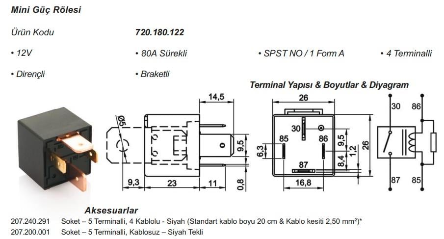 12V RÖLE 4 UÇLU 80 A (70 A TİPİ) (2 UÇ KÜÇÜK / 2 UÇ BÜYÜK) (6.3 MM / 9.5 MM) (DİRENÇLİ) (ELO 720180122)